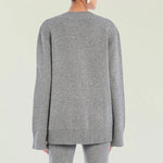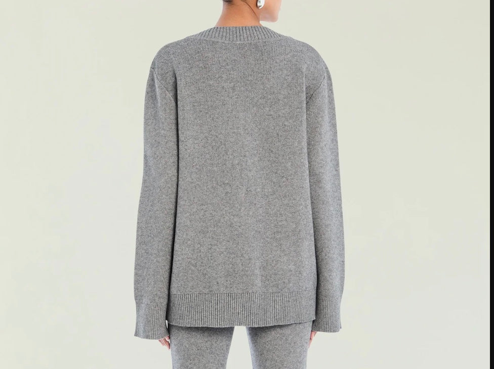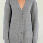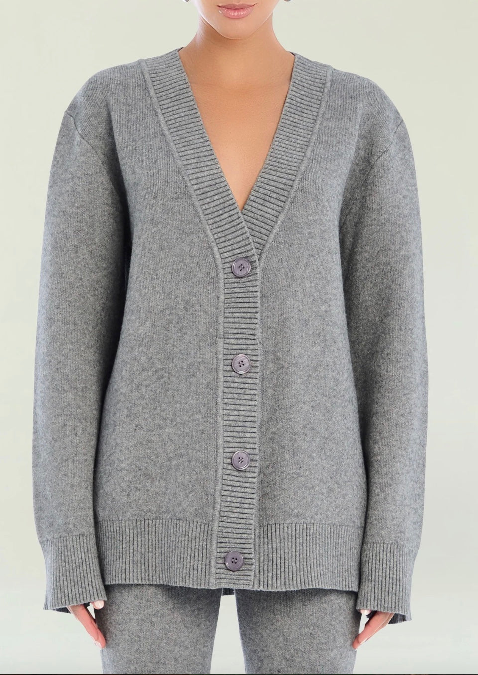 This relaxed fit, button-up knit cardigan with ribbed cuffs and hem is perfect for the season. Pair with the Classic Girl Knit Flare Pant. Shown here in Medium Grey.