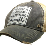 Vintage distressed trucker cap "I've Got A Good Heart But This Mouth" Color: Black distressed Material: cotton/polyester blend, mesh back. Size: one size fits most, with an adjustable snap back strap. Unisex cap.