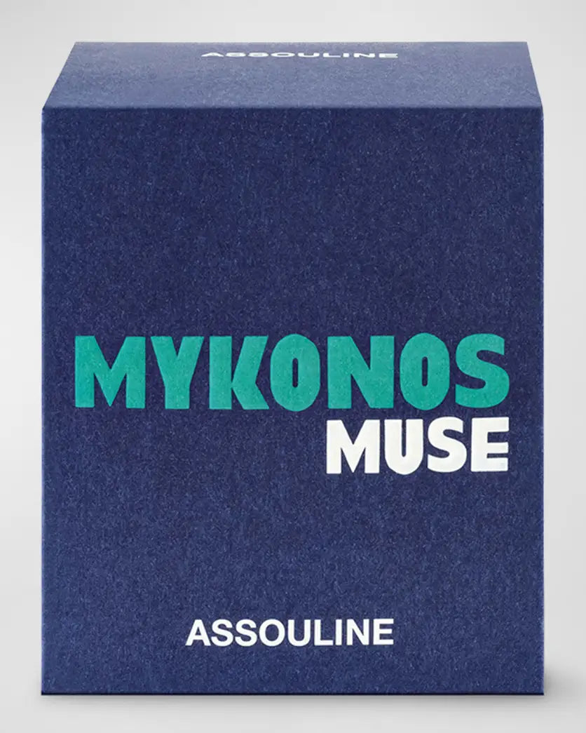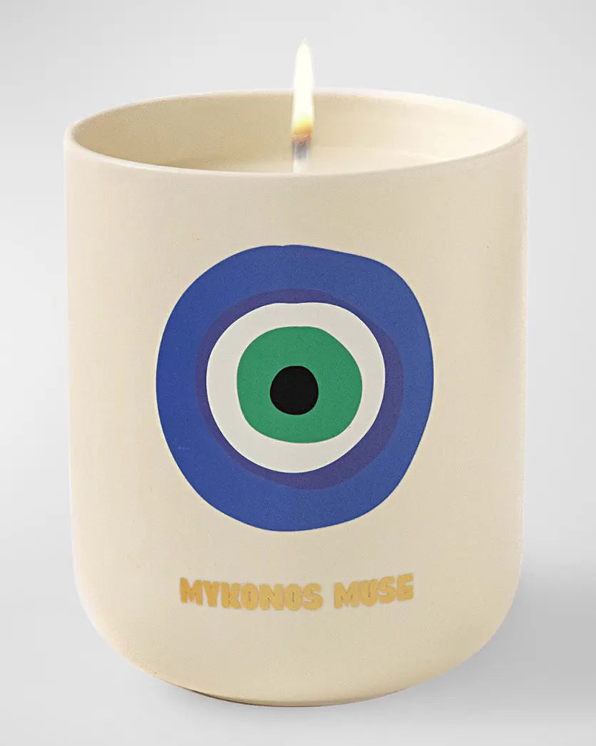 Journey to Mykonos with the Mykonos Muse Travel from Home Candle. A magically seductive fragrance of cyclamen, - sweet, spicy - herbaceous scents, are as immersive as the Aegean Sea. Familiar notes of almond, green fig and natural aromas of tonka bean conjure a striking vista of scent transporting you to the white-and-blue island in the blink of an eye. Housed in a ceramic vessel, the candle features the same iconic serigraphy of symbol seen on the coordinating Mykonos Muse book. Collect every destination from the Travel from Home Candle Collection.