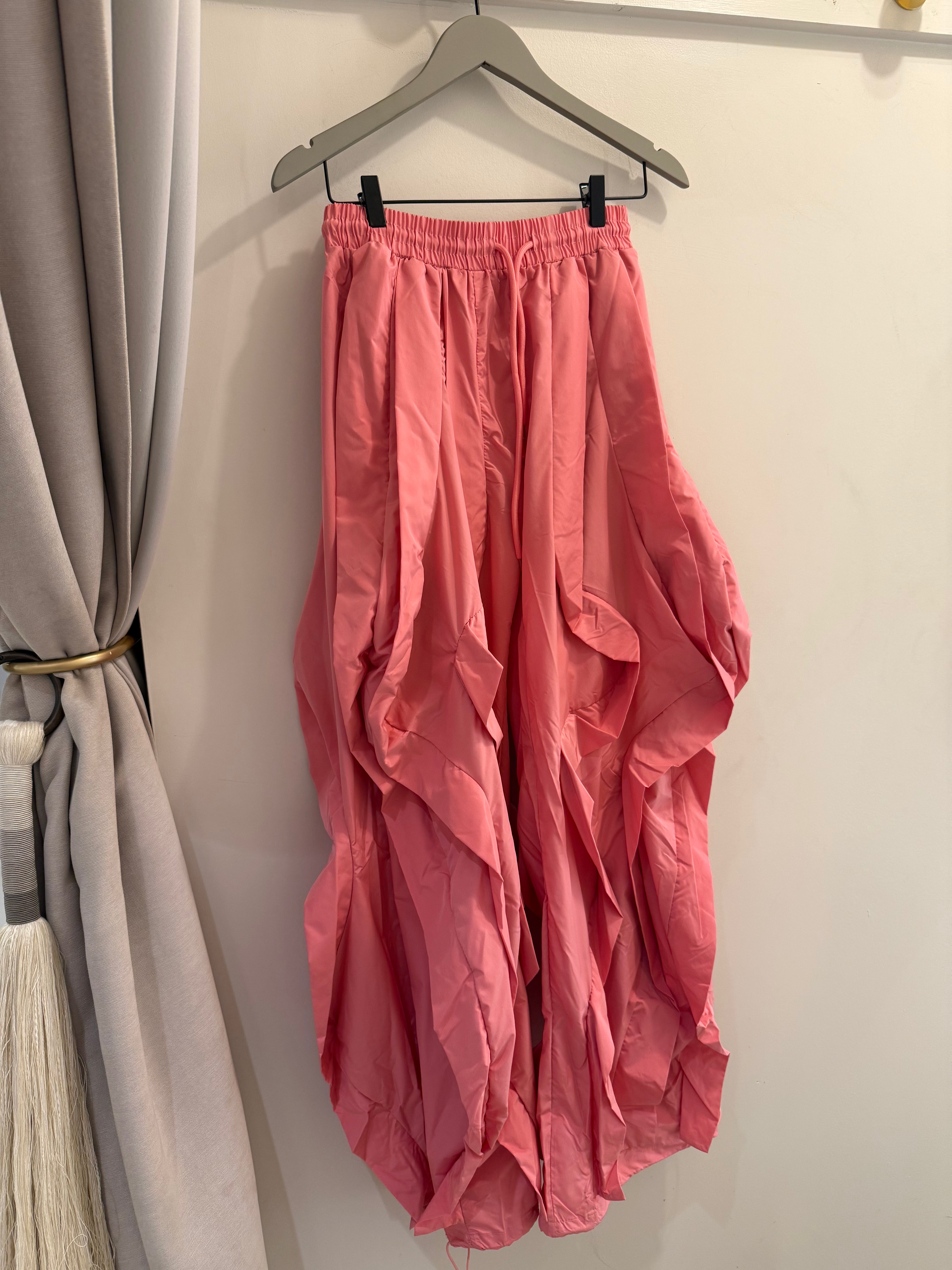 Pink Wavy Oversized Wide Leg Ruffle Drawstring Elastic Waist Jogger Pants.