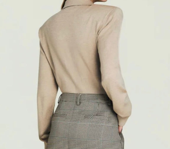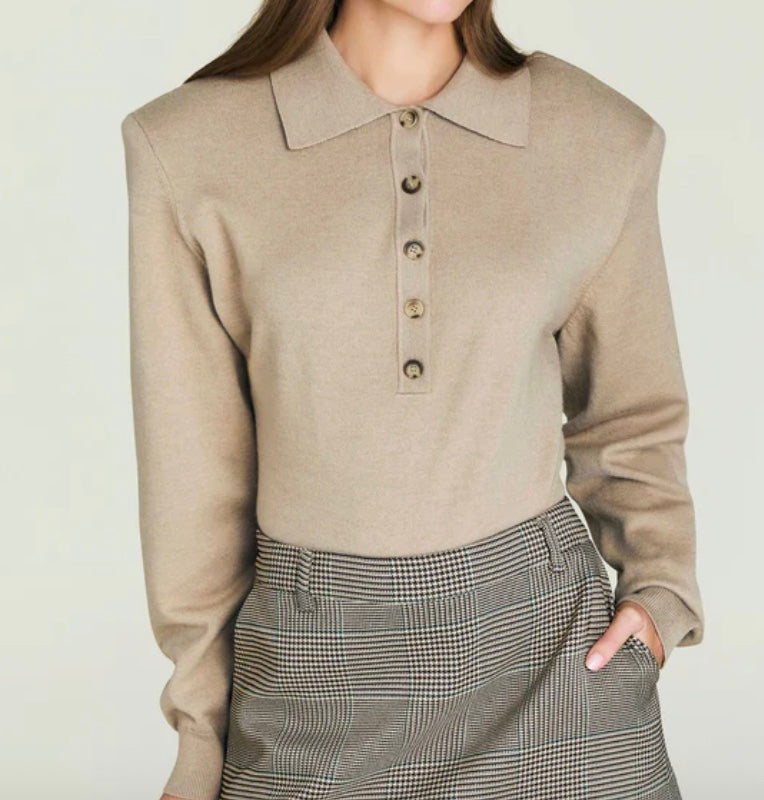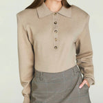 Collared, long sleeve bodysuit with button-up neckline and shoulder pads. Shown here in desert taupe color.