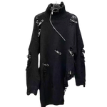Classic knitwear takes on punk energy in this distressed black turtleneck. Crafted with intentional rips and raw-edge details, it is accented by oversized safety pins for a deconstructed, street-style finish. The soft knit fabric and relaxed fit make it wearable while still delivering high-impact design. Style it tucked into tailored trousers, layered under an oversized blazer, or over flowing skirts for a mix of edge and sophistication.