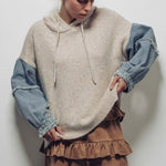 Cozy meets cool in this relaxed hoodie that blends soft texture with an edgy denim twist. Perfect for effortless layering on off-duty days. - Soft heathered knit body with washed denim contrast sleeves - Raw-edge detailing for a casual, deconstructed feel - Adjustable drawstring hood adds a laid-back touch *Fit:Relaxed, slightly oversized silhouette with dropped shoulders for easy comfort and style.